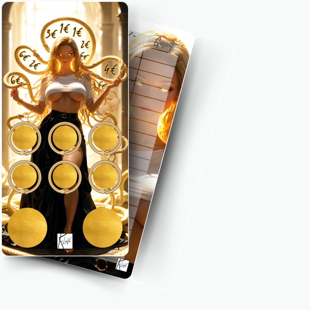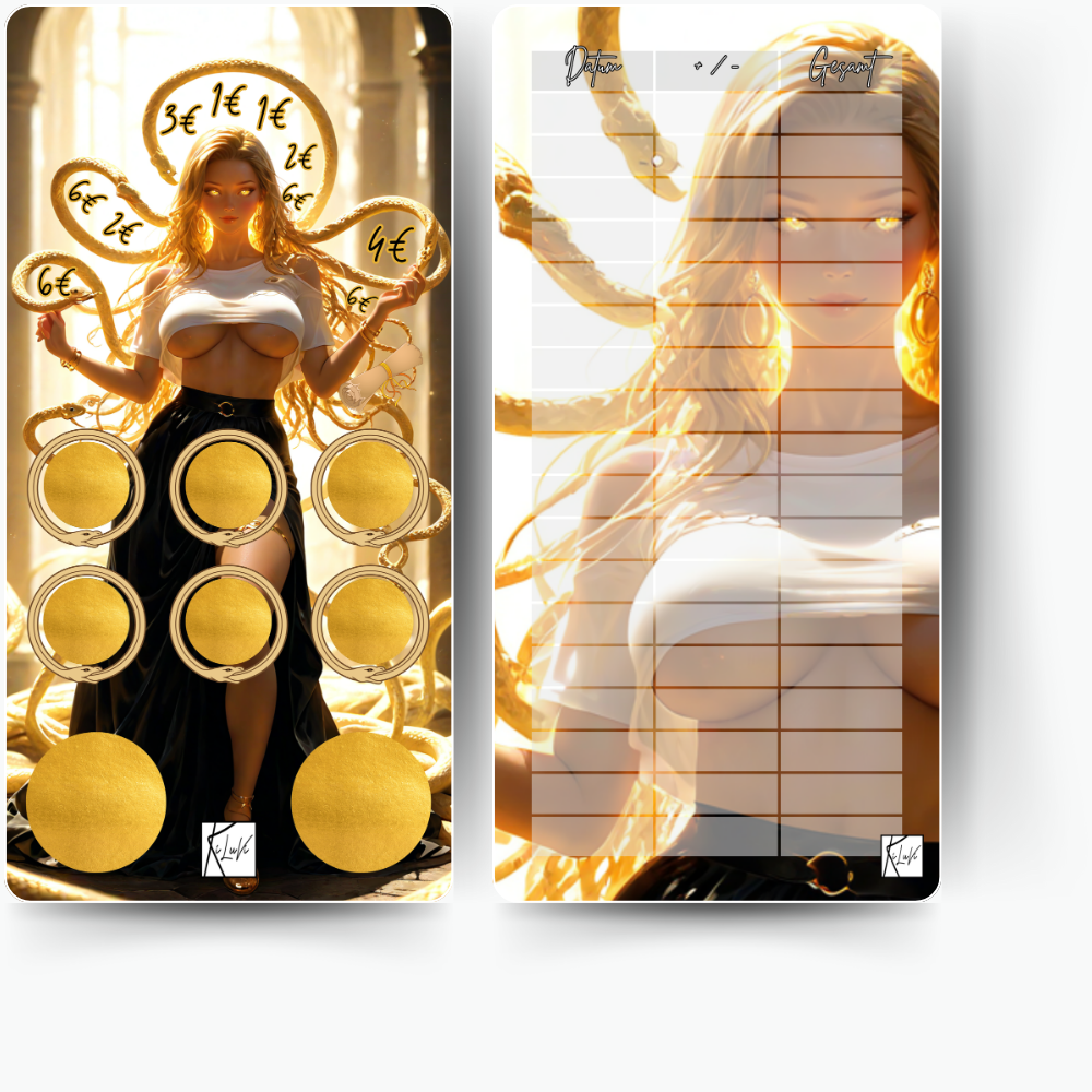 Spare mit Medusa! Die CHallenge mit einer Medusa in moderner Form, enthält Rubbelfelder, Abstreichfelder und zwei weitere Sparfelder! - Handgemacht und selber gedruckt auf hochwertigem 200g Papier. (Doppelseitig - auf der Rückseite ist ein Tracker um deinen Fortschritt zu dokumentieren)